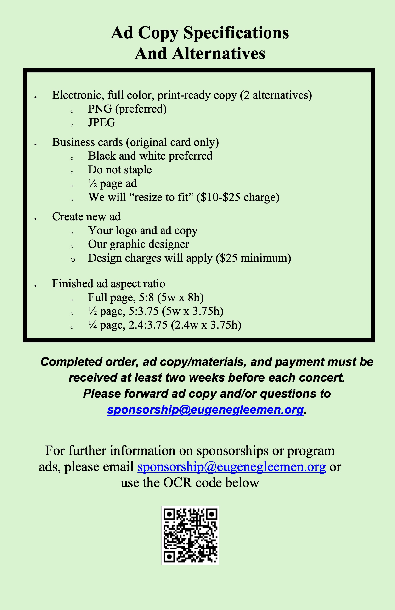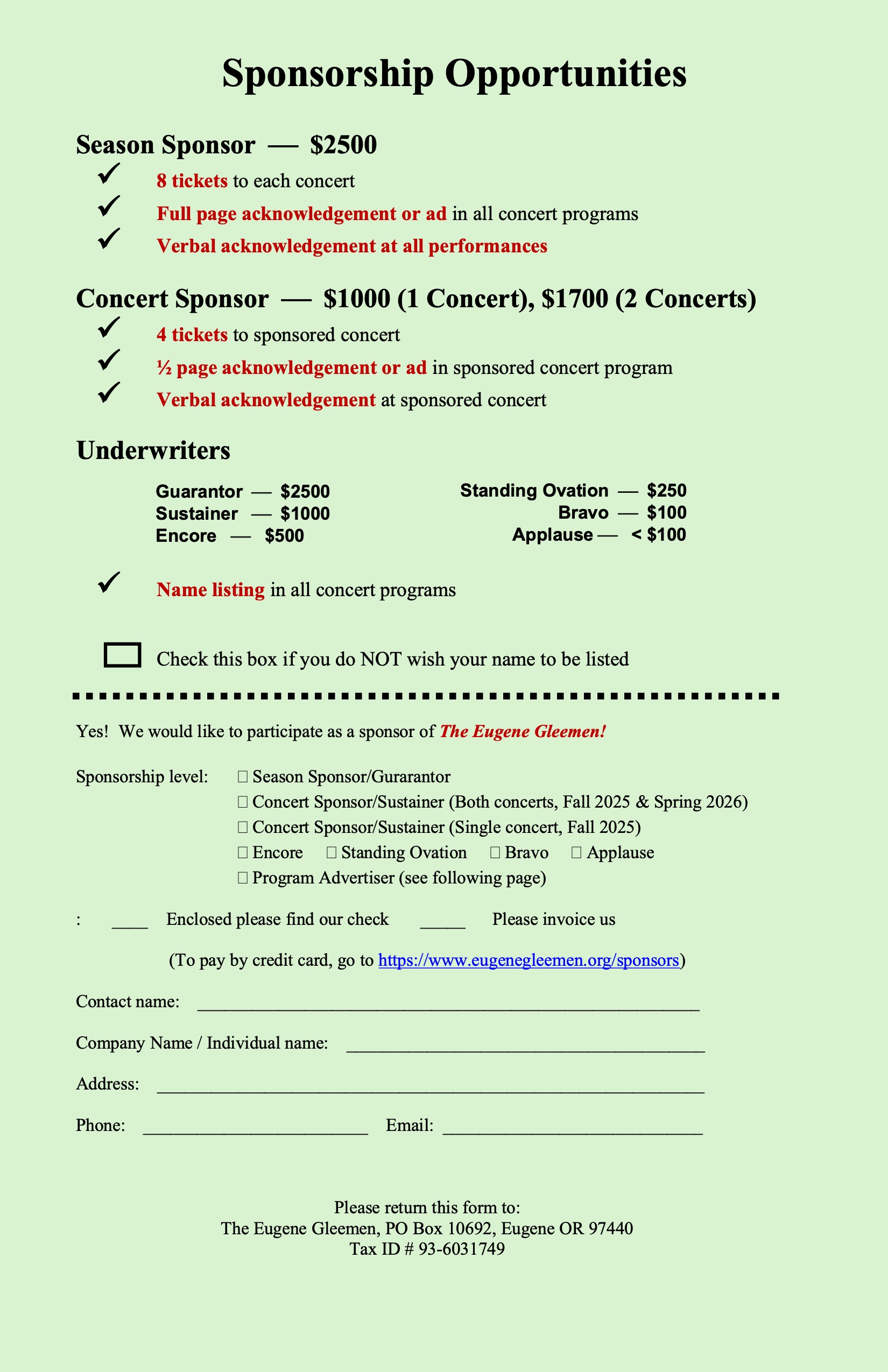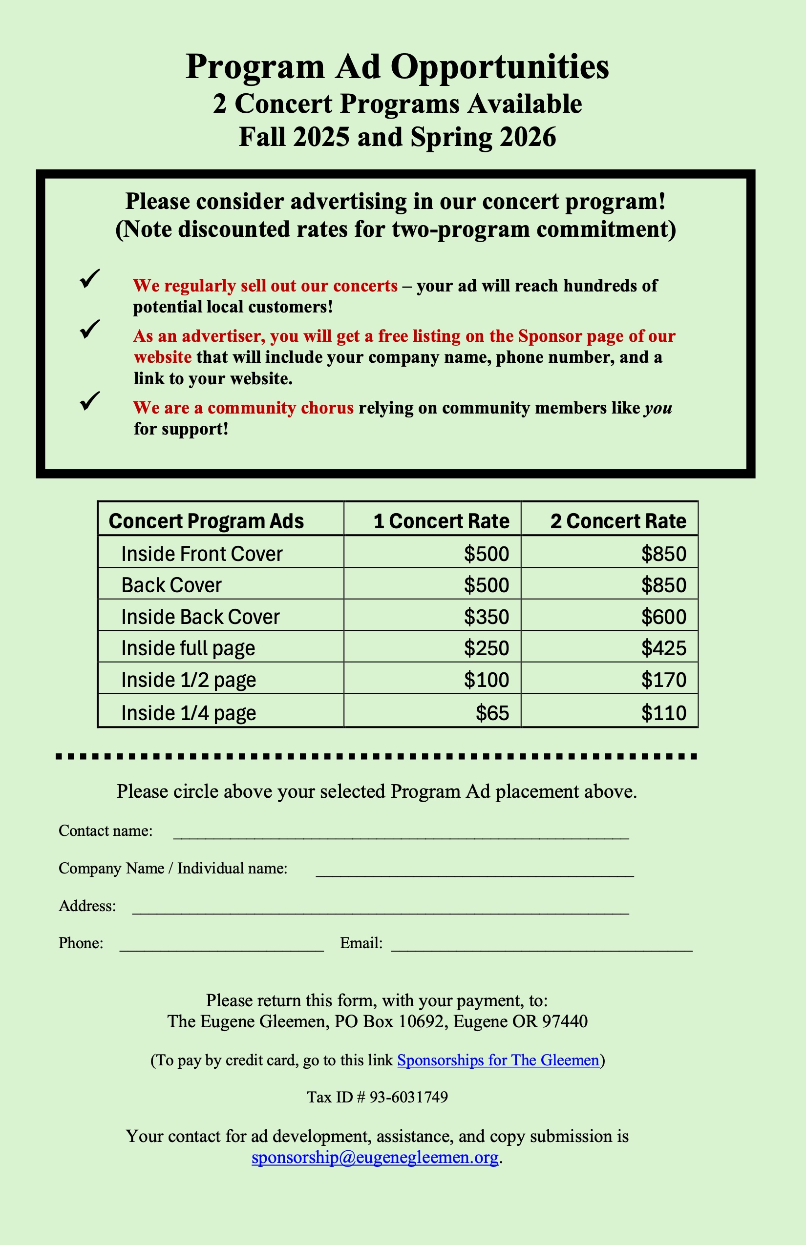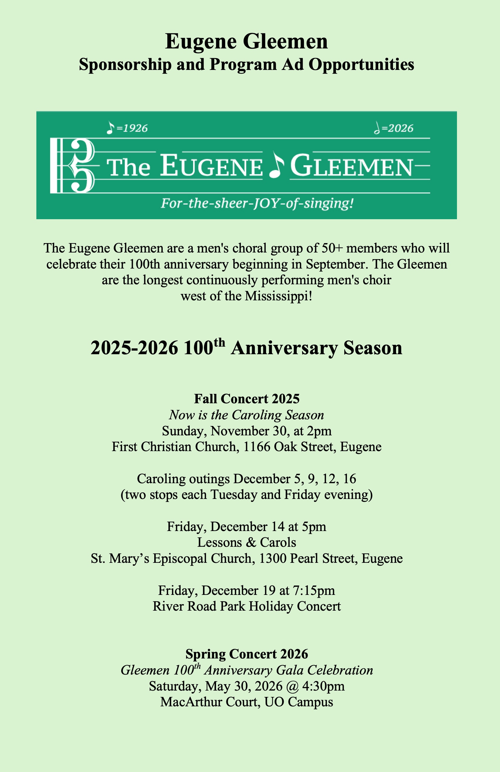Partnering with the Eugene Gleemen is an excellent way to reach hundreds of potential local customers and support a community institution. The 2025–2026 season marks the choir's 100th Anniversary, offering a high-profile opportunity to feature y
